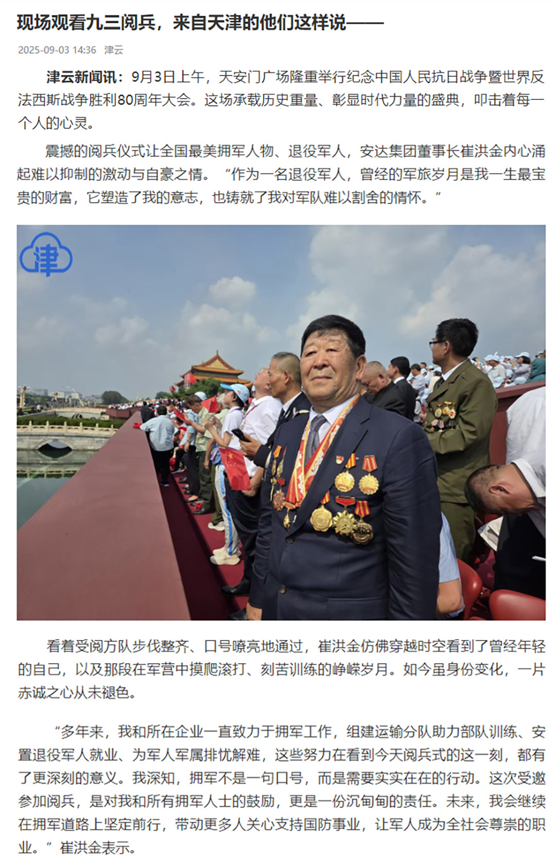 崔洪金参加9.3阅兵 天津《今晚报》专题报道